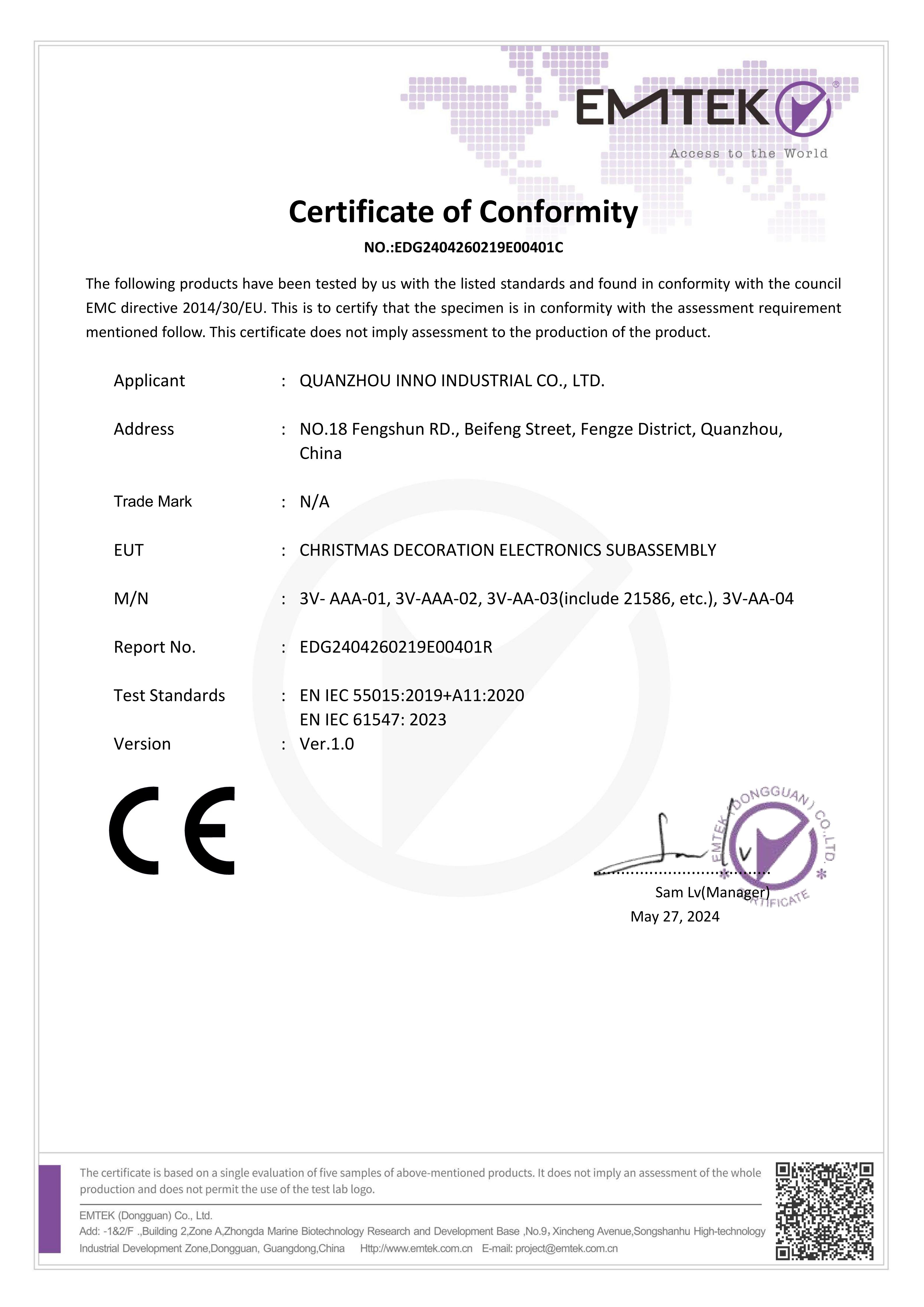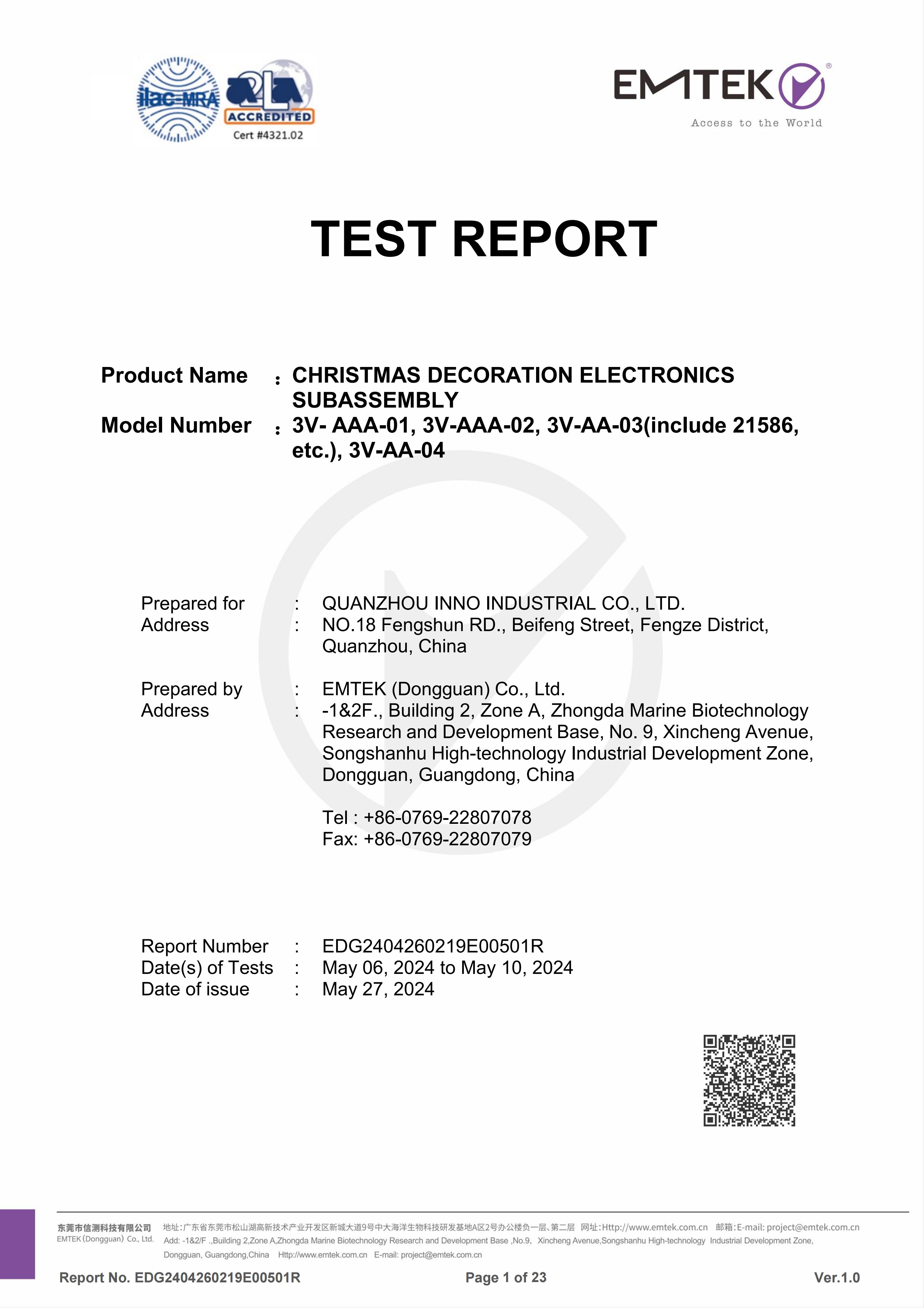 Established in 2014, Quanzhou INNO Industrial Co., Ltd. occupies a facility of 14,000 square meters. This industry and trade enterprise focuses on Christmas decorations, decorative products, LED lights and garden solar decorations. Our factory is BSCI-compliant and has passed the audit from Walmart and Disney. Our goods have also obtained CE, RoHS, and REACH certifications.