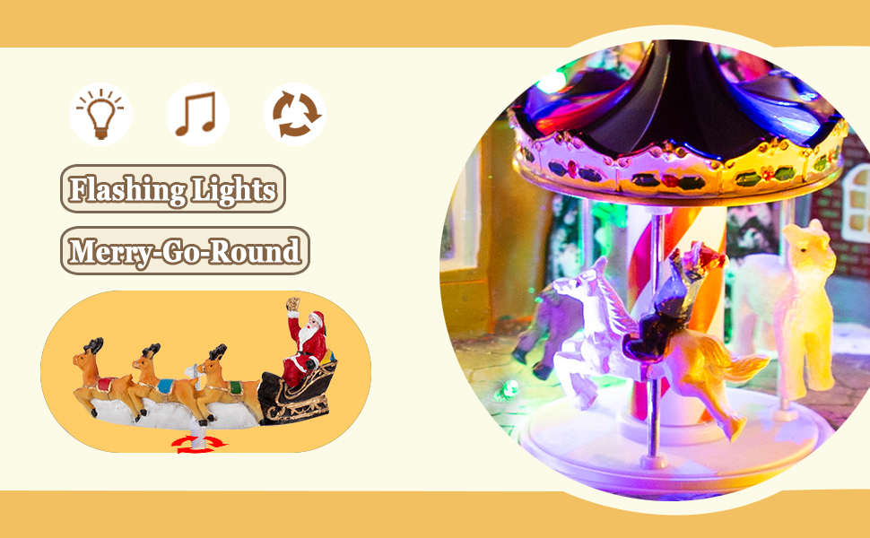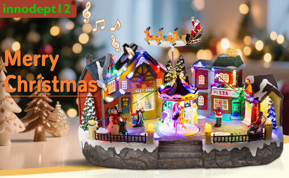 Animated Christmas Village Town Square with Rotating Carousel & Flying Santa Sleigh | innodept12