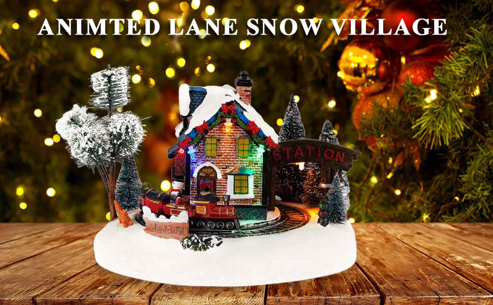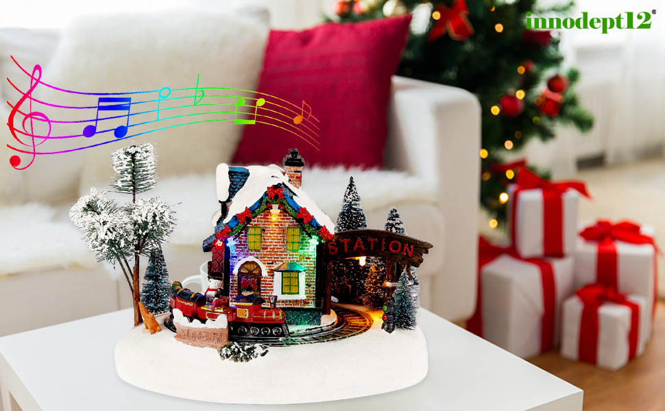 Animated Christmas Village Station with Rotating Train & LED Lights