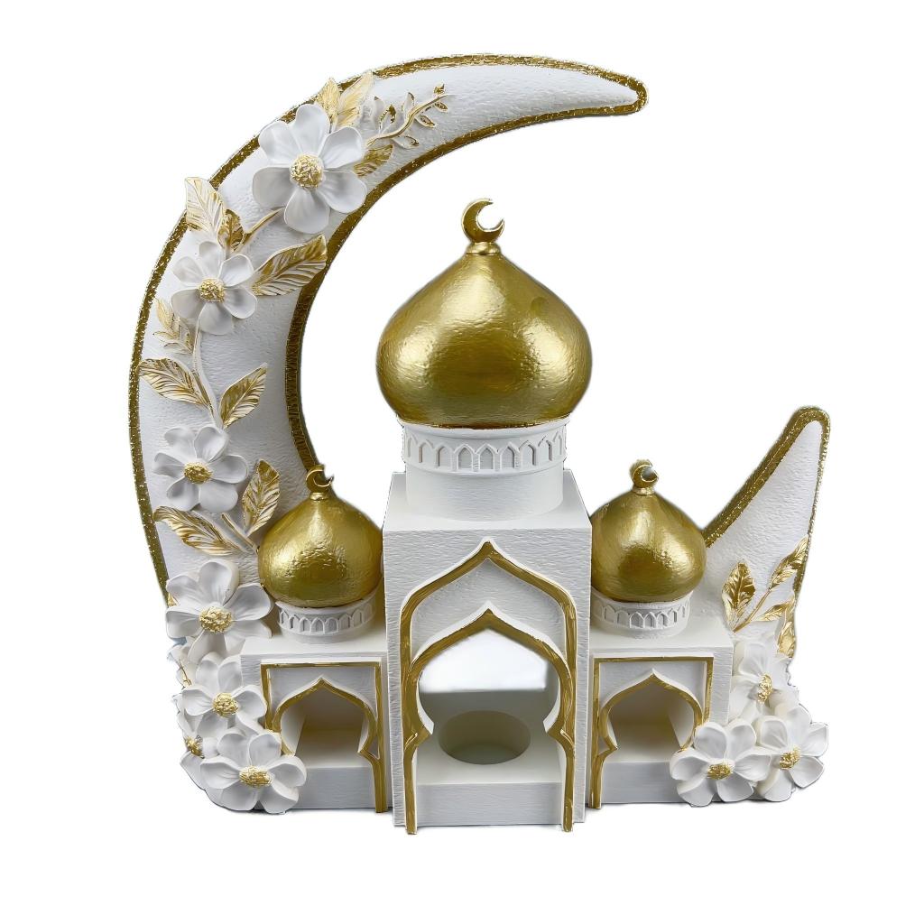 - Elegant Islamic moon mosque tealight holder made of resin, designed for Eid and Ramadan decoration, creating a warm spiritual atmosphere for Muslim homes and festive displays
