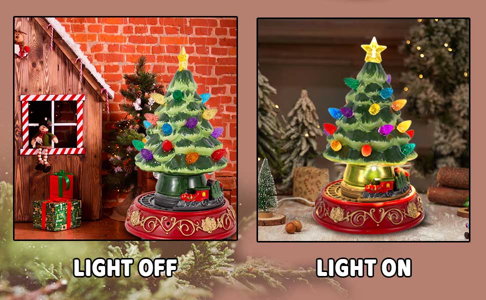 Captivating Animated Motion: Features a mesmerizing rotating scene, including a miniature holiday train and a team of toy soldier figures that glide gracefully around the tree.