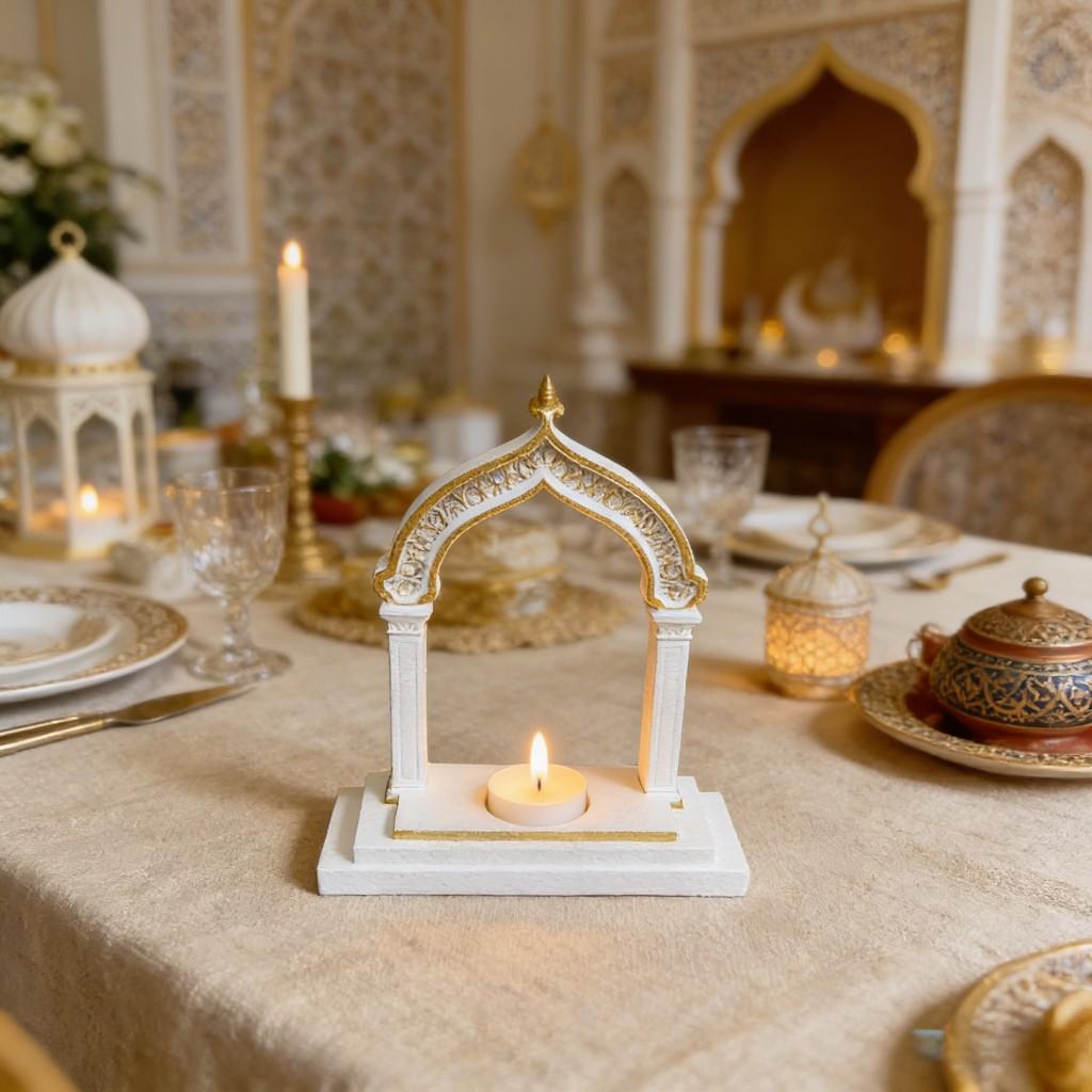 This candle holder features an ornate Islamic arch design with gold gilding, perfectly matching Ramadan/Eid festival themes—adds a sacred & warm atmosphere to your home.