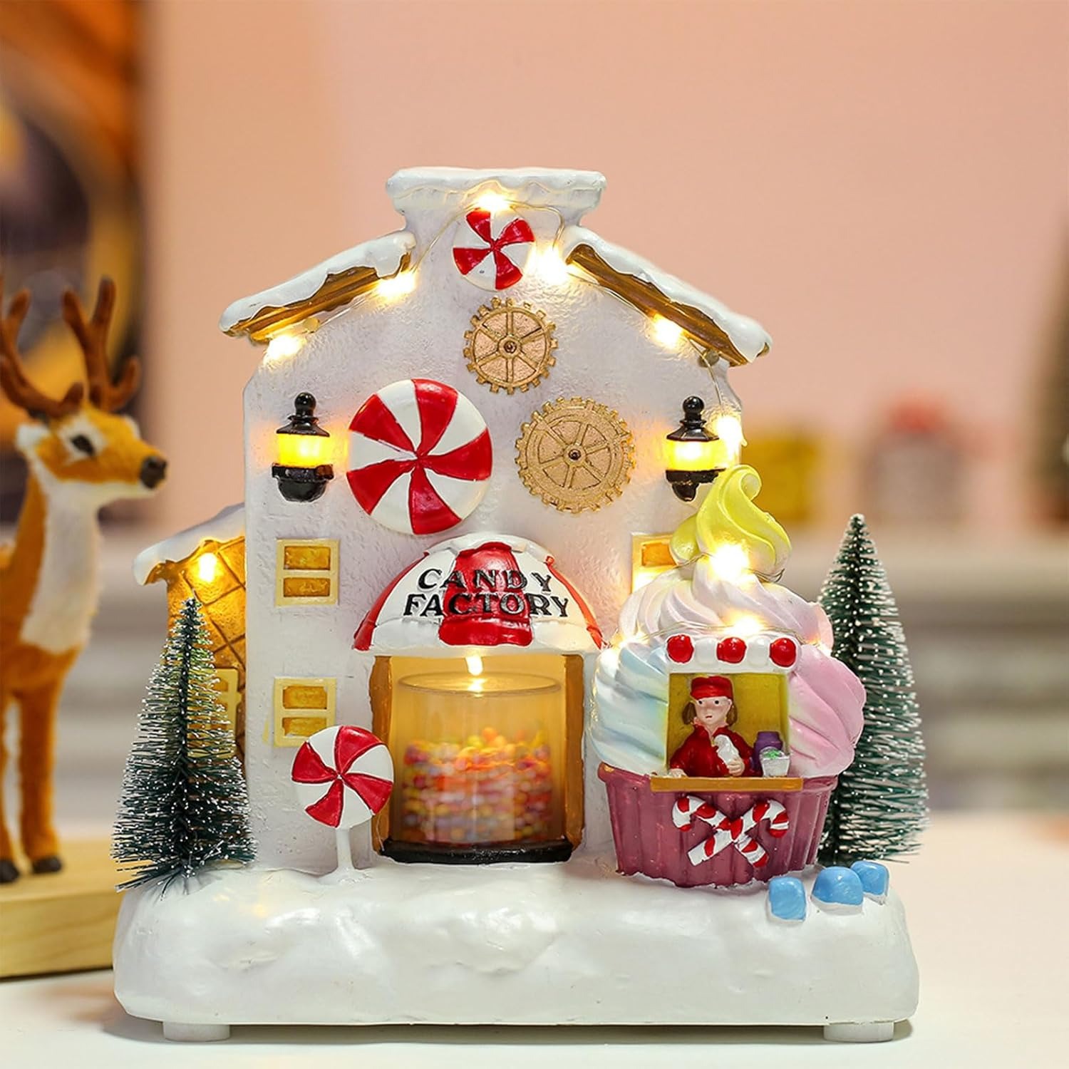 Animated Christmas Candy Factory with Warm LED GlowStep into a world of pure imagination with the innodept12 Animated Candy Factory. This enchanting tabletop display brings a festive sugar-coated dream to life. Watch as the central candy jar "churns" with colorful sweets while the warm white LED lanterns and string lights illuminate the snowy facade. Featuring a charming ice cream-shaped booth and hand-painted peppermint accents, it's the perfect centerpiece to spark joy in kids and collectors alike.
